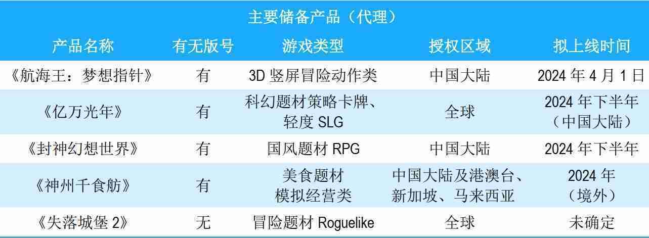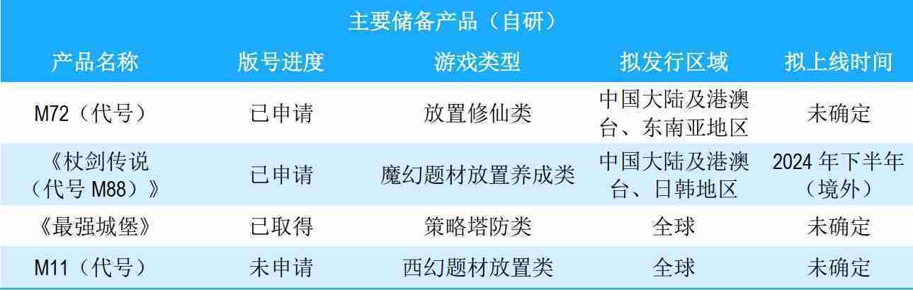 公司储备的多个自研、、代理产品都在有序推进当中,,,,涵盖放置类、、策略类、、、模拟经营类、、、RPG、、、Roguelike等多元化游戏品类,,,,储备的主要自研和代理产品如下::::
